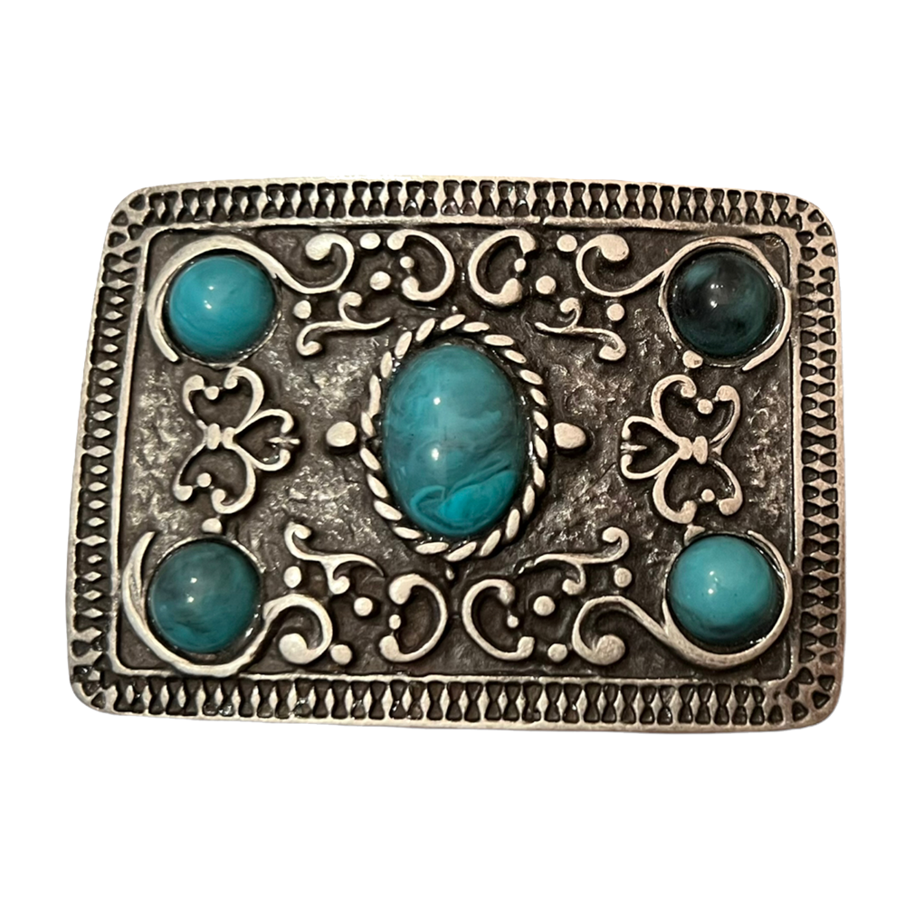 Hebilla de fantasia rectangular de7,5X5,5cms. en color plata antigua y con 5 piedras en color turquesa.