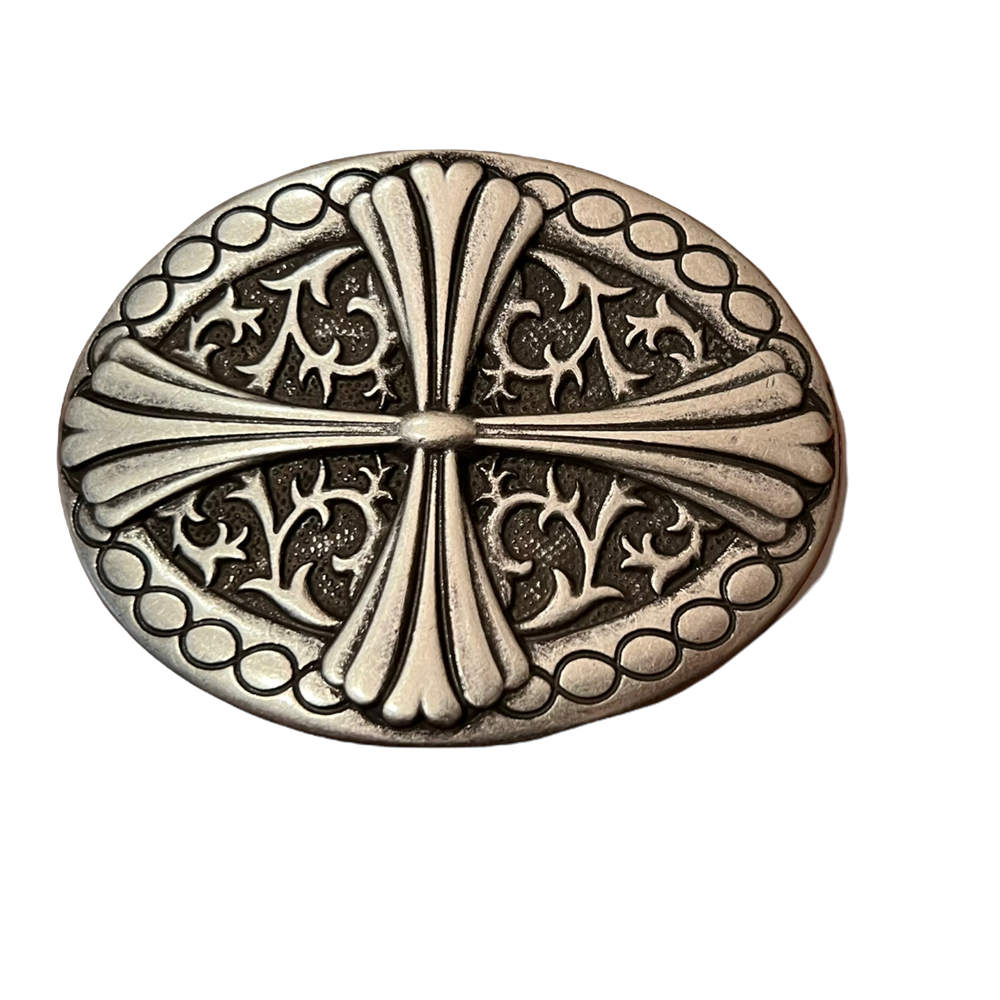 Hebilla ovalada de 9X6,5cms. En color plata antigua con cruz en relieve.