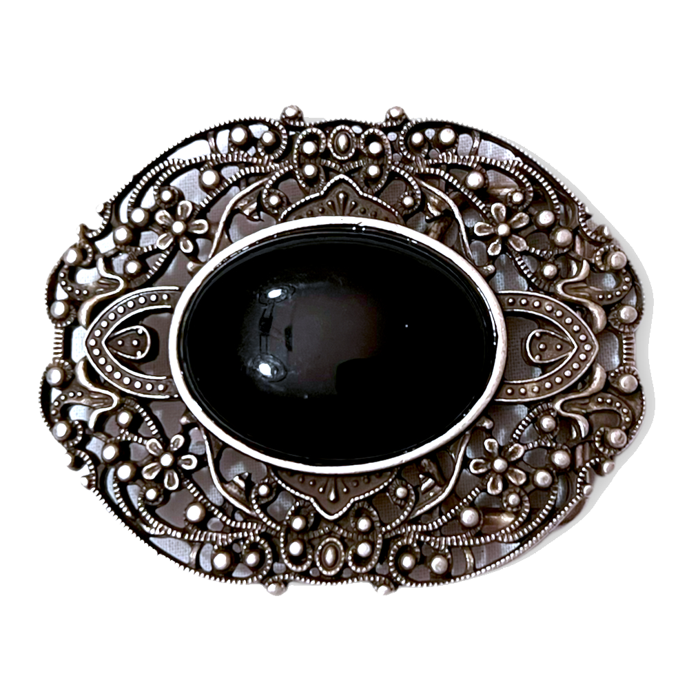 Hebilla ovalada de 8,5 X6,5cms. en color plata vieja con dibujos calados en el metal y gran piedra en color negro.