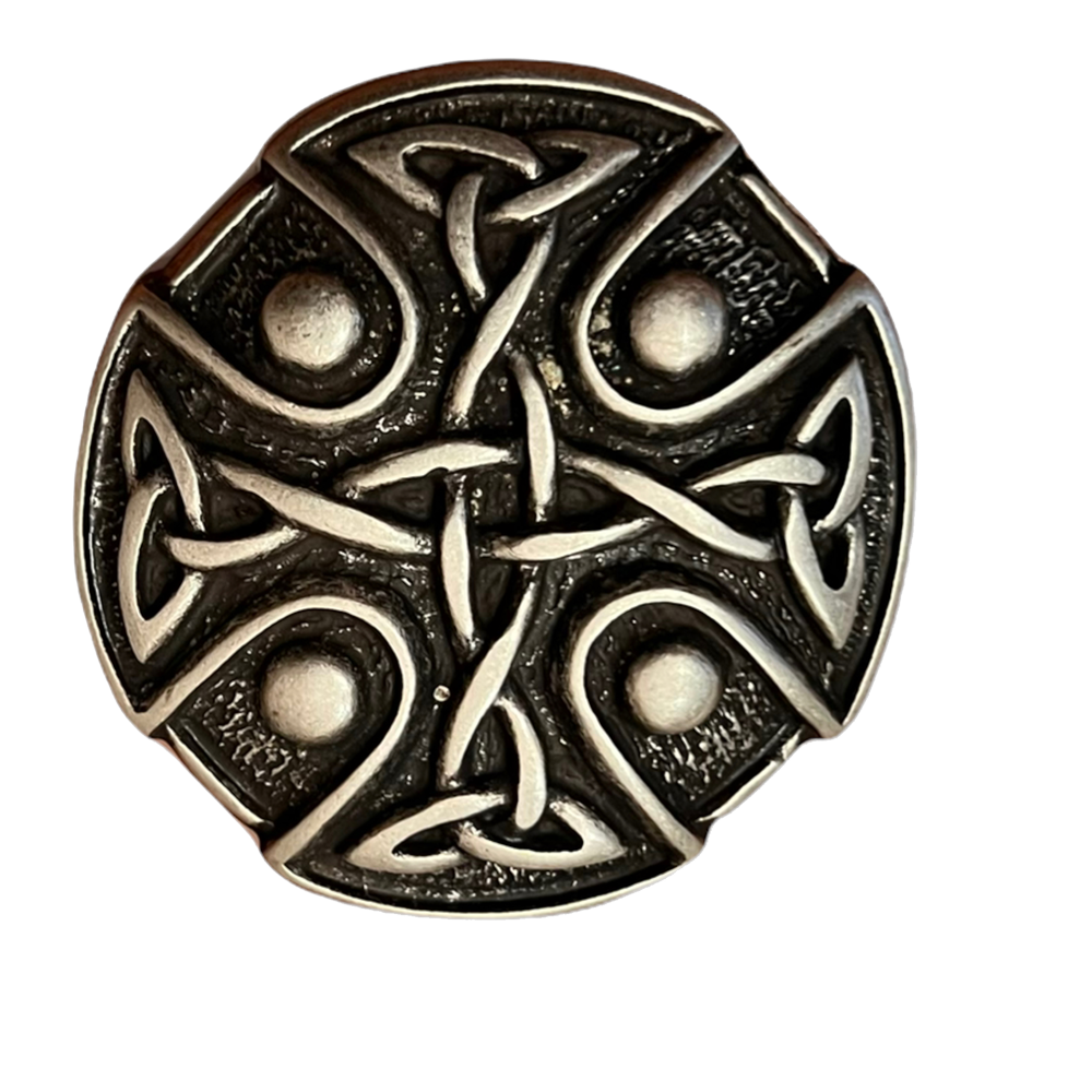 Hebilla grande y redonda de 7,2cms. de diámetro,en color plata antigua y con dibujos en simbología tribal