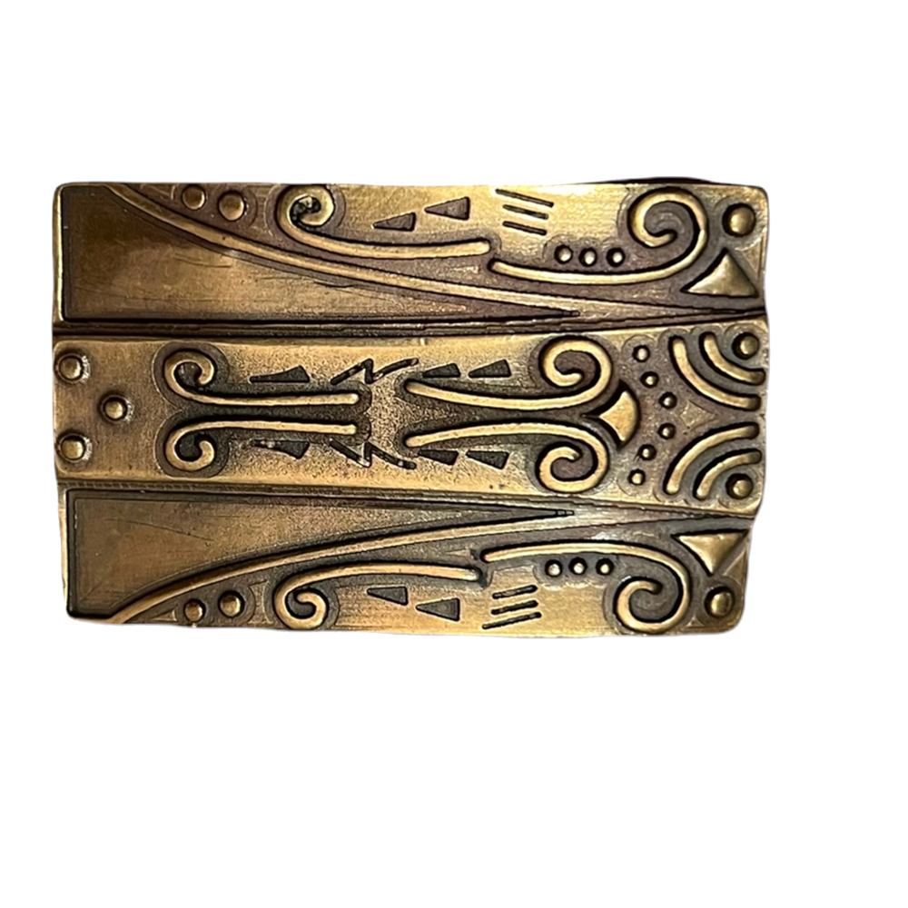 Hebilla en color bronce rectangular de 7X4,5cms con relieves etnicos para correa de cinturón de 4 cms. ancho.